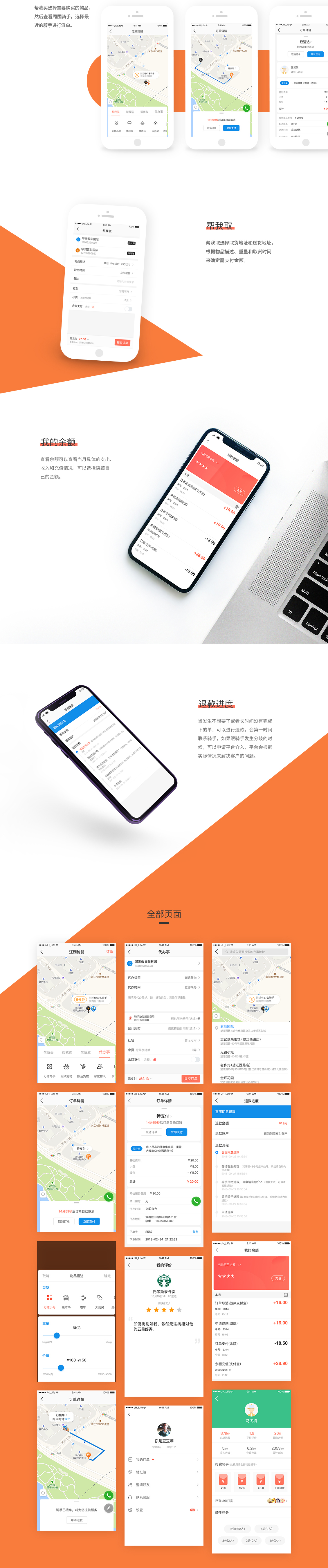 该产品主要围绕跑腿来进行设计;其中以我买、帮我送、帮我取代和代办事4个模块体现,整体视觉感以简洁和易操作为主;整体颜色这块在接手后一在确定下来,最终确定了蓝色和橙色,去繁化简