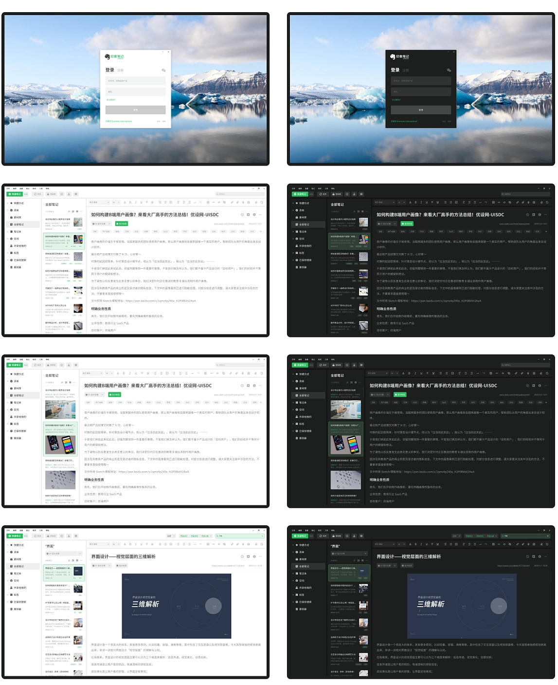 “全部”、“笔记本” 、“清单” 、“空间” 以及还没有在Windows上线的“素材库”等,设计一个简洁美观的界面。
